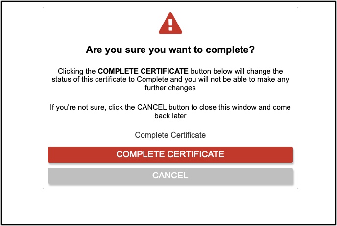 Once clicked this will trigger a warning to give you one further opportunity to return to the Certificate and make further changes.