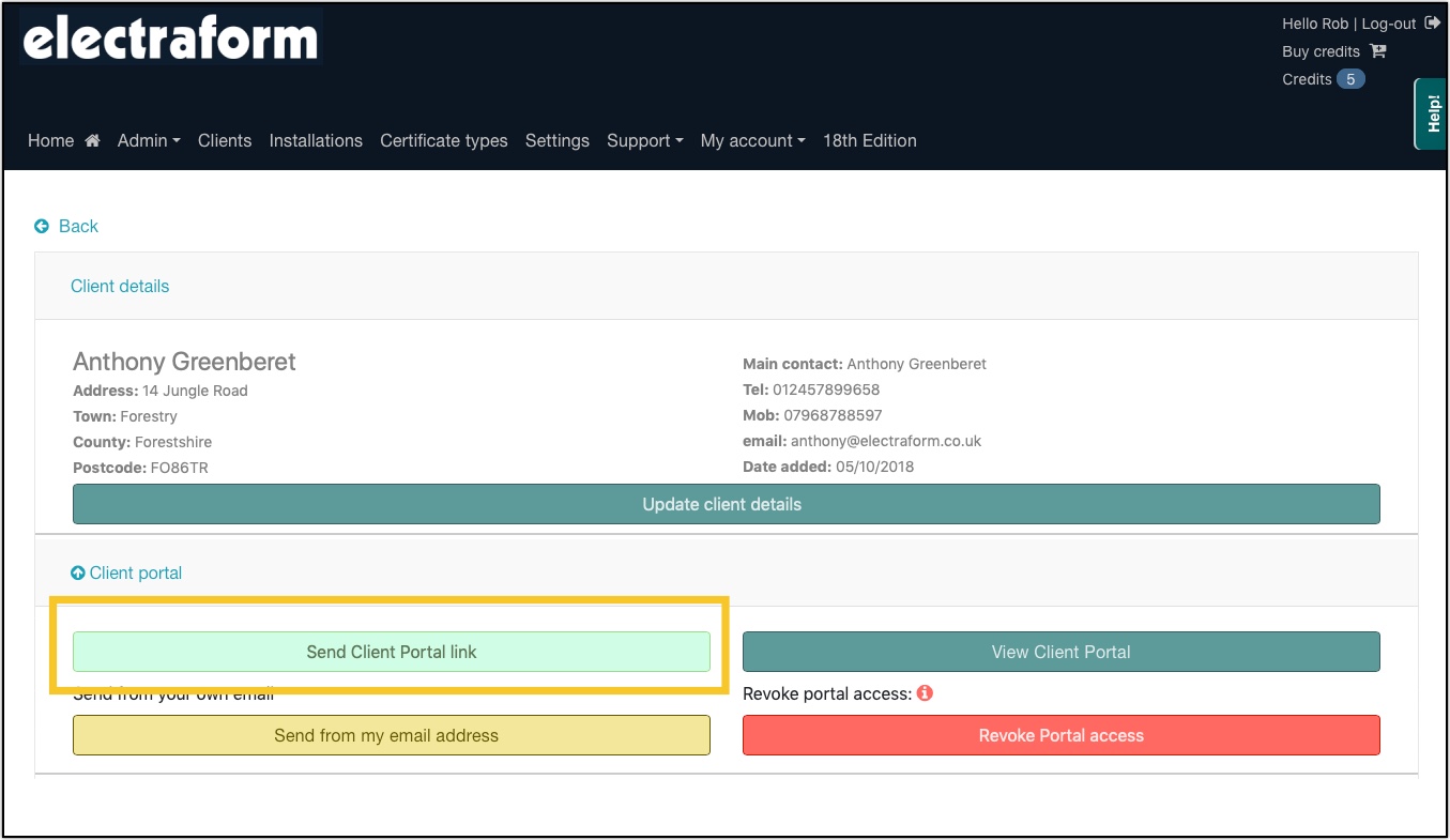 Each client has a unique portal where they can view, download and print completed certificates and reports. To send them their unique link, click the Send Client Portal link button.