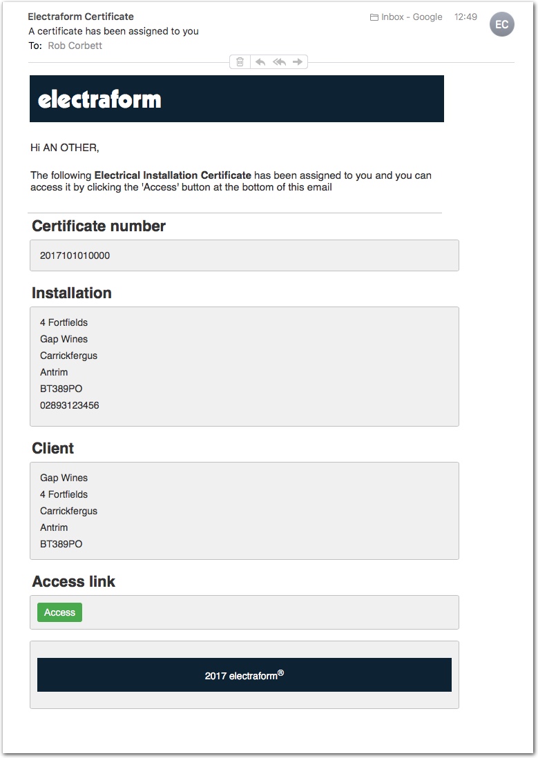 The chosen engineer will receive an email at the email address associated with their details. The email will detail all the information about where the installation to be tested is, and provides a button link at the foot of the email to access the certificate on whatever device they choose.