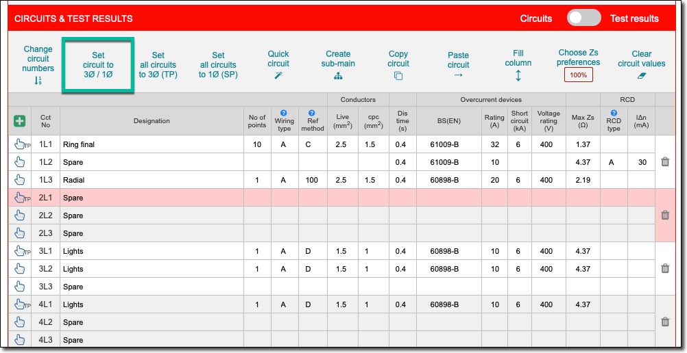 Click the hand next to the circuit, the row will turn pink. Then click the Set circuit to 3Ø/1Ø button.