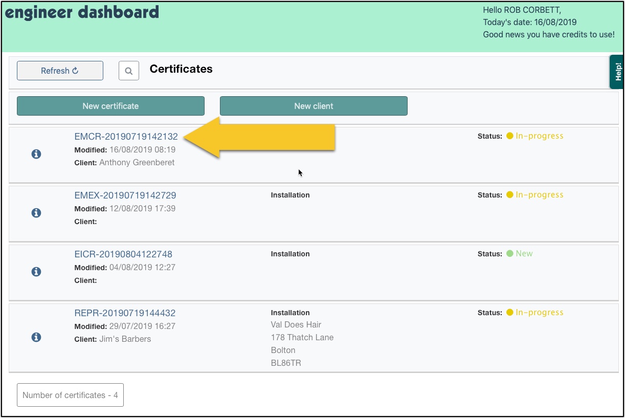 The engineer dashboard looks like this - with all certificates and reports assigned to the engineer listed