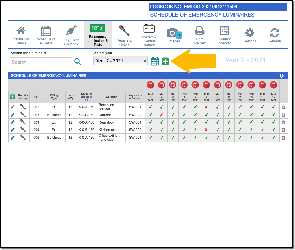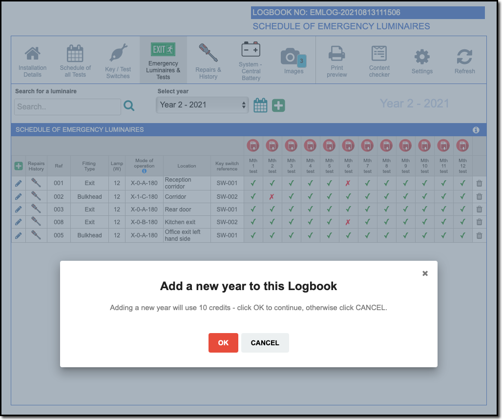 When 12 months of testing has been carried out, a new Logbook Year can be added
